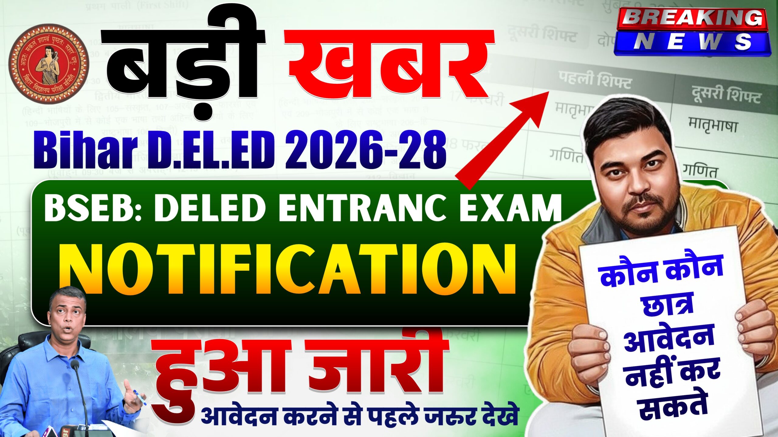 बिहार विद्यालय परीक्षा समिति (BSEB) ने D.El.Ed (Diploma in Elementary Education) सत्र 2026–28 में प्रवेश के लिए आधिकारिक नोटिफिकेशन जारी कर दिया है। इस बार भी प्रवेश प्रक्रिया ऑनलाइन संयुक्त प्रवेश परीक्षा (Computer Based Test) के आधार पर होगी।