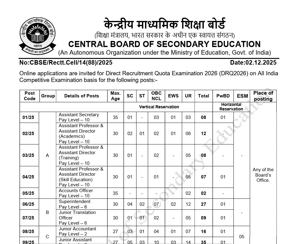 केंद्रीय माध्यमिक शिक्षा बोर्ड (CBSE) द्वारा सीधी भर्ती (DRQ2026) के नियम
