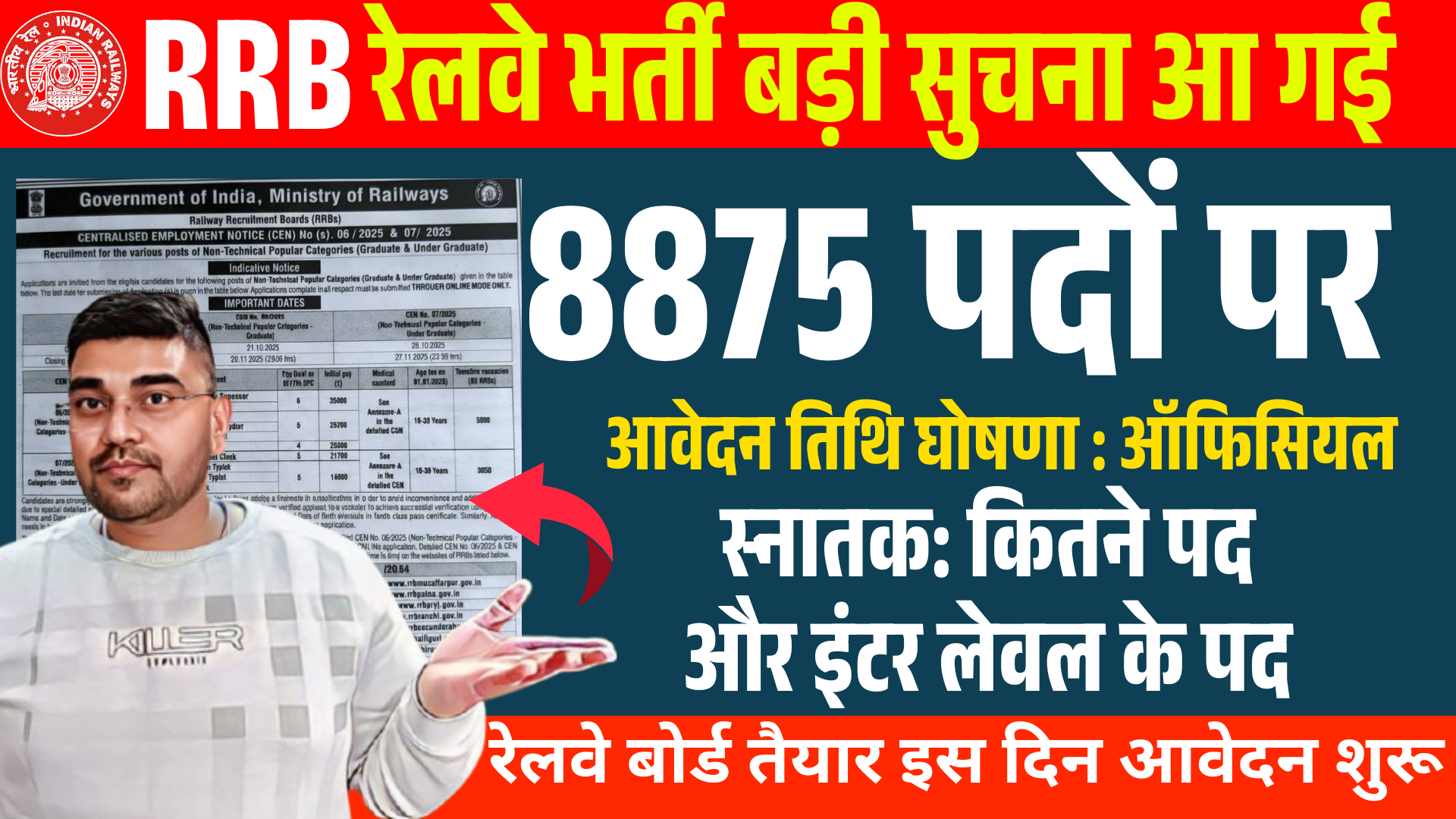 RRB NTPC Graduate CEN 06/2025: रेलवे भर्ती बोर्ड (RRB) ने गैर-तकनीकी लोकप्रिय श्रेणियों (NTPC) स्नातक स्तर CEN 06/2025 के लिए अधिसूचना जारी कर दी है। आरआरबी एनटीपीसी ग्रेजुएट सीईएन 06/2025 पूर्ण अधिसूचना 20 अक्टूबर 2025 को जारी की गई है और ऑनलाइन आवेदन 21 अक्टूबर से 20 नवंबर 2025 तक आमंत्रित किए गए हैं। योग्य उम्मीदवार Railway RRB NTPC (Graduate) New Vacancy 2025 के लिए वेबसाइट rrbapply.gov.in या नीचे दिए गए सीधे लिंक से आवेदन कर सकेंगे। आरआरबी ने 20 अक्टूबर 2025 को नई एनटीपीसी ग्रेड्यूट लेवल 5800 रिक्ति अधिसूचना जारी की है। आरआरबी एनटीपीसी ग्रेजुएट सीईएन 06/2025 से संबंधित सभी विवरण यहां दिए गए हैं।